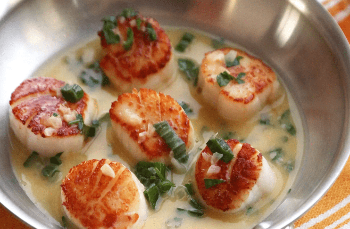1. Place a skillet over medium-high heat until thoroughly heated. Coat scallops with cooking spray, and then salt and pepper right before placing on skillet. Carefully place scallops in hot skillet. Sear 3-5 minutes or until browned, flip sides, and cook another 2-3 minutes. Remove scallops from pan, and keep them warm in an oven at 150-175ºF.